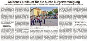 Seit Oktober 1973 gibt es die Bürgervereinigung Alt-Münster – so viele Jahre, so viele Erlebnisse! Das Jubiläum feiern wir dieses Jahr mit mehreren Events, darunter die zweite Auflage unseres Altstadt- und Weinfests zusammen mit der Feuerwehr. Das Höchster Kreisblatt hat uns einen Artikel zur Ankündigung des Fests gewidmet, den wir Euch hier nicht vorenthalten wollen! Der Artikel als PDF